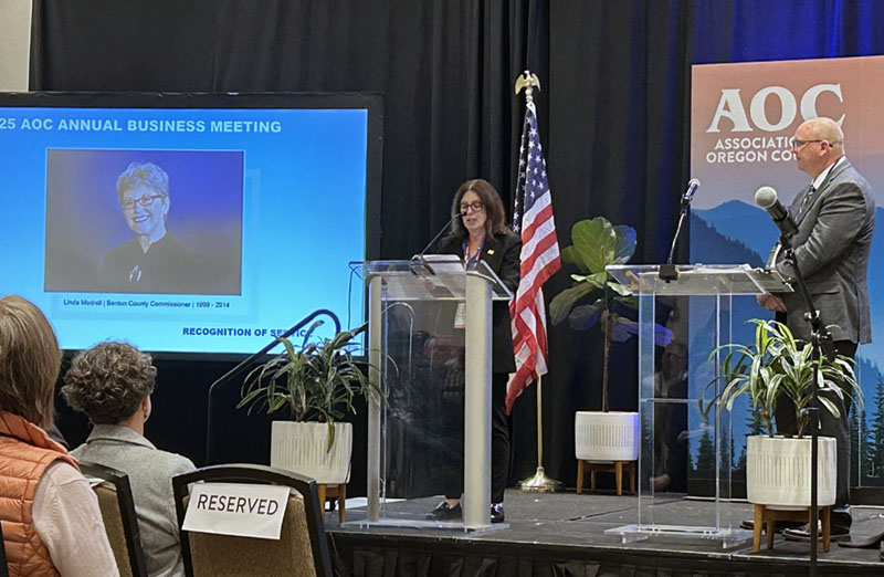 Modrell’s service extended to the state level, with appointments on several task forces and steering committees. She served in many roles with the Association of Oregon Counties (AOC), including president of the organization. At this year’s statewide conference on Nov. 20, she was honored for her many years of service.