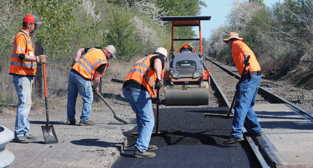 On sunny spring days, Benton County Road Crew members have little time to smell the flowers. Maintaining roads, bridges and signs throughout the County results in a running to-do list of repairs and upgrade. One of these projects had them working alongside Portland & Western Railroad on April 6 to repair the railroad grade crossing on Northwest Ryals Avenue near Adair Village, improving safety and reliability for everyone who travels through the area.